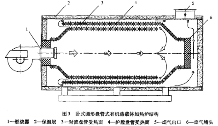 臥式圓形盤管式有機熱載體加熱爐可以降低鍋爐房的整體高度和造價 ,簡化支撐結構。另外,燃燒器的安裝采用水平布置,這樣有利于燃燒器的檢修和維護。
